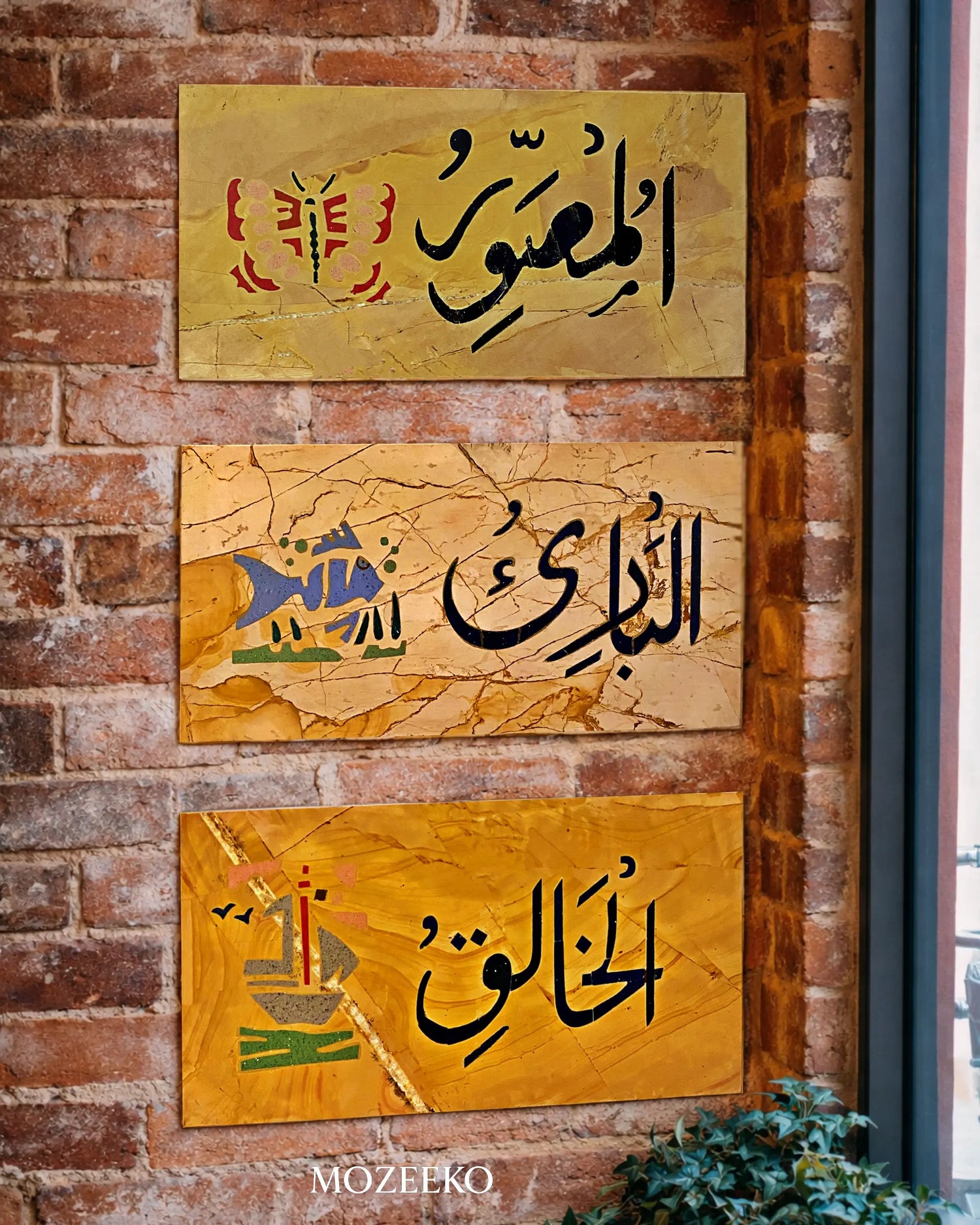 A custom wall installation crafted from rare natural Burma Teak marble, prized for its rich wood-like veining. The sacred names of Allah are meticulously inlaid using colored Starlite artificial marble, set into three 12 × 24 inch marble panels and permanently installed as an architectural feature for a private client.