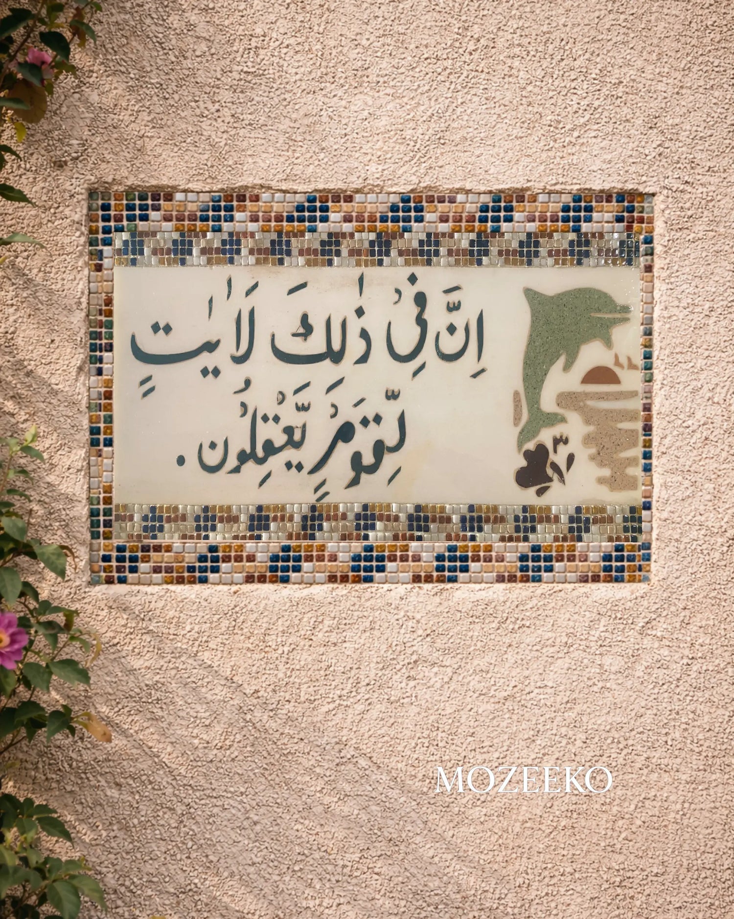 A bespoke outdoor wall installation crafted in natural Afghan White marble, featuring a Quranic verse precision-inlaid using Starlite marble. The composition is framed with hand-laid tumbled marble mosaic, incorporating subtle sea-life motifs that symbolically reflect the signs of Allah in creation. Designed and installed as a permanent exterior architectural feature for a private client.