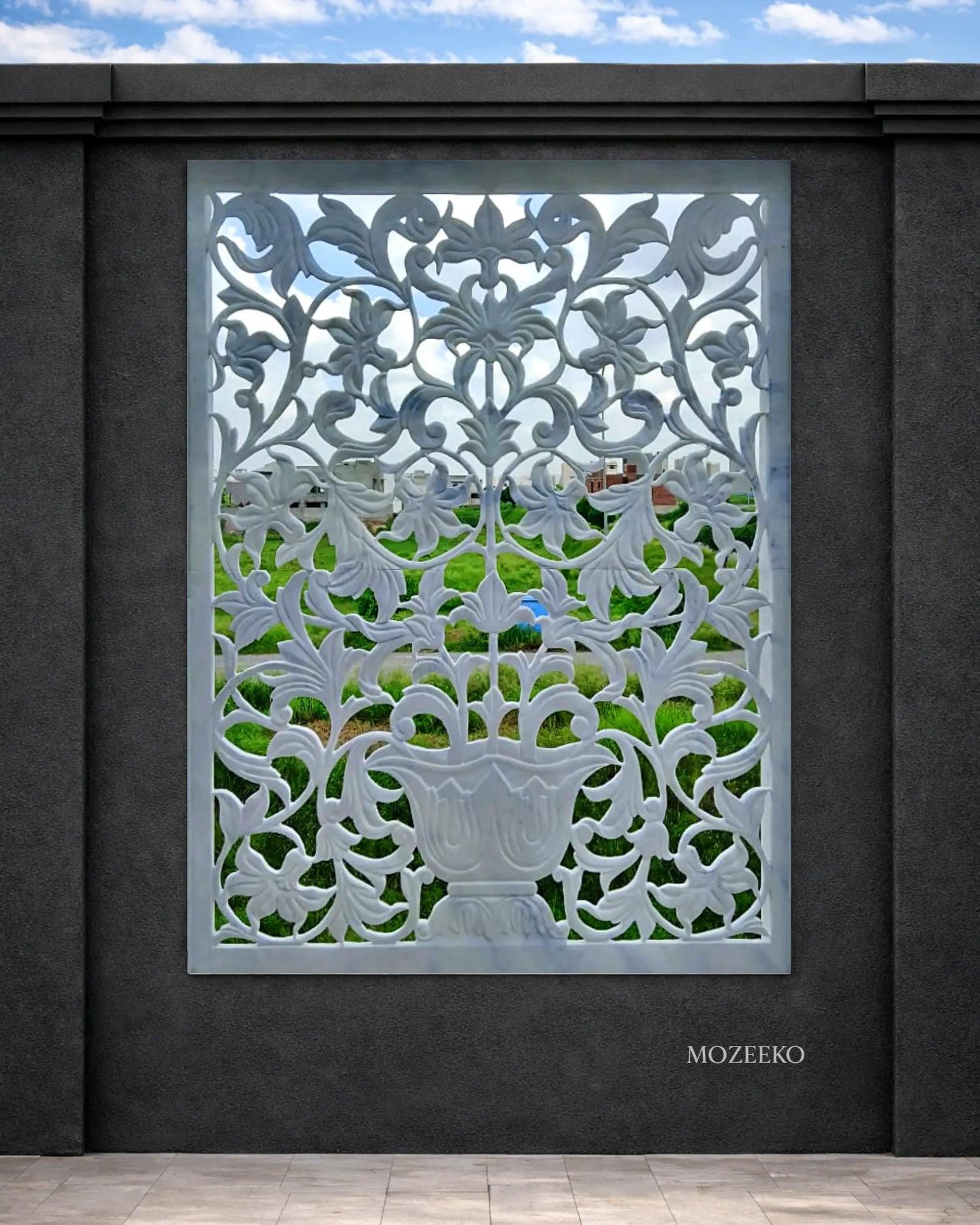 A bespoke boundary-wall installation crafted in natural Ziarat White marble, featuring a hand-carved jali with classical floral motifs. Designed to balance privacy, light, and ventilation, the marble lattice is framed within a charcoal-toned exterior wall and installed as a permanent architectural element for a private residence.