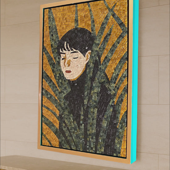 “This handcrafted mosaic captures the quiet grace of a girl hidden among leaves, a timeless piece blending art and stone. Perfect for gallery walls, living rooms, or entryways seeking elegance and emotion.”
