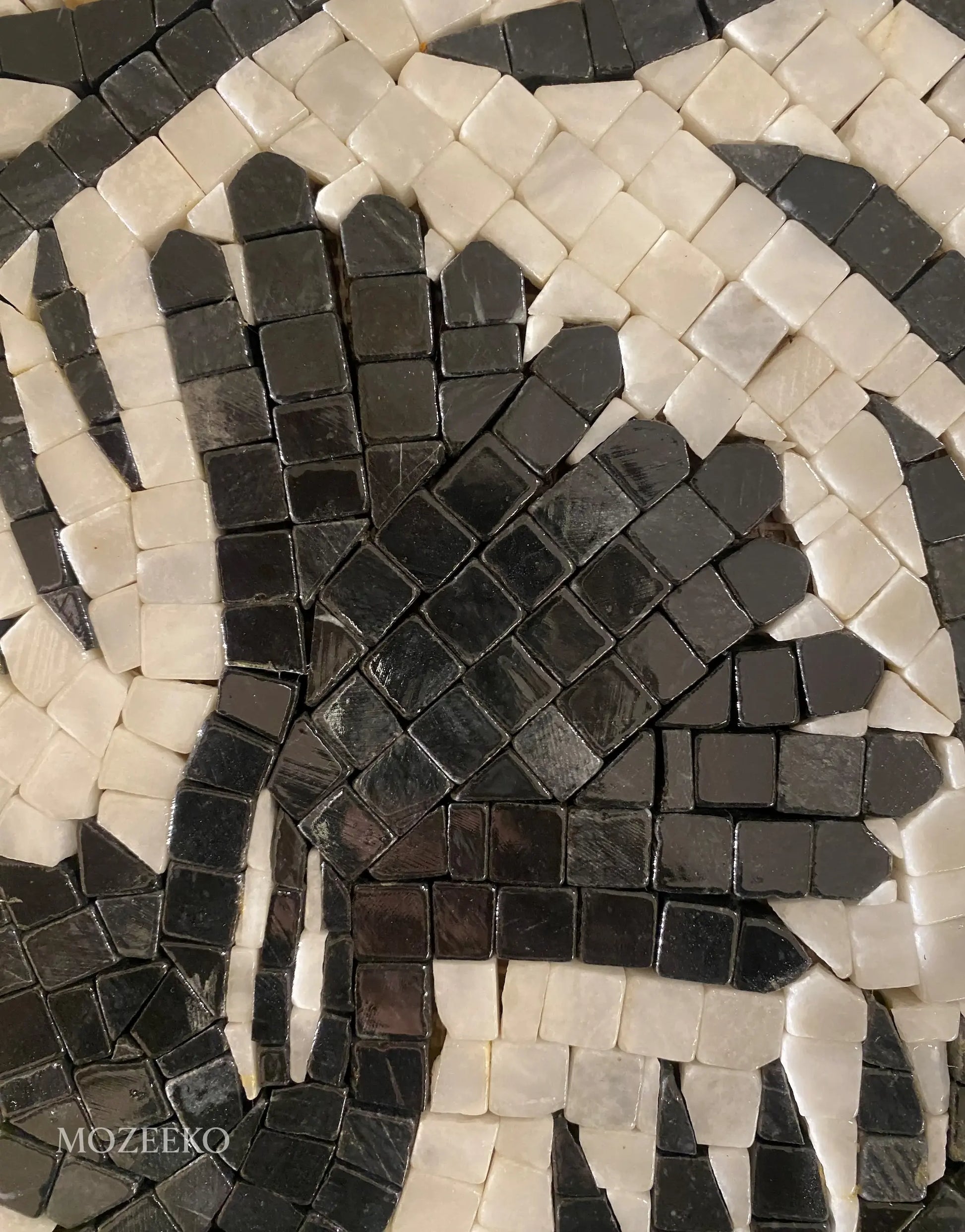 A monochrome masterpiece where a bird in flight emerges from bold black-and-white marble patterns. The hand-cut tesserae create striking contrasts, giving the artwork a modern yet timeless aura.